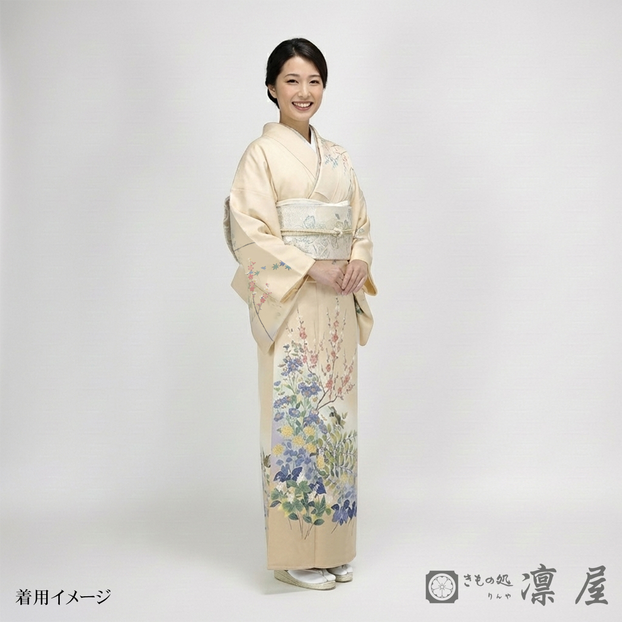 本作の題は『華かおるころ』。裾の白茶色のぼかしは大地を思わせ、そして間に流れるブルーとグリーンのぼかしは青々とした草花たちから感じる新緑の風のよう。新しい生命の息吹を感じるような瑞々しさが表現されています。