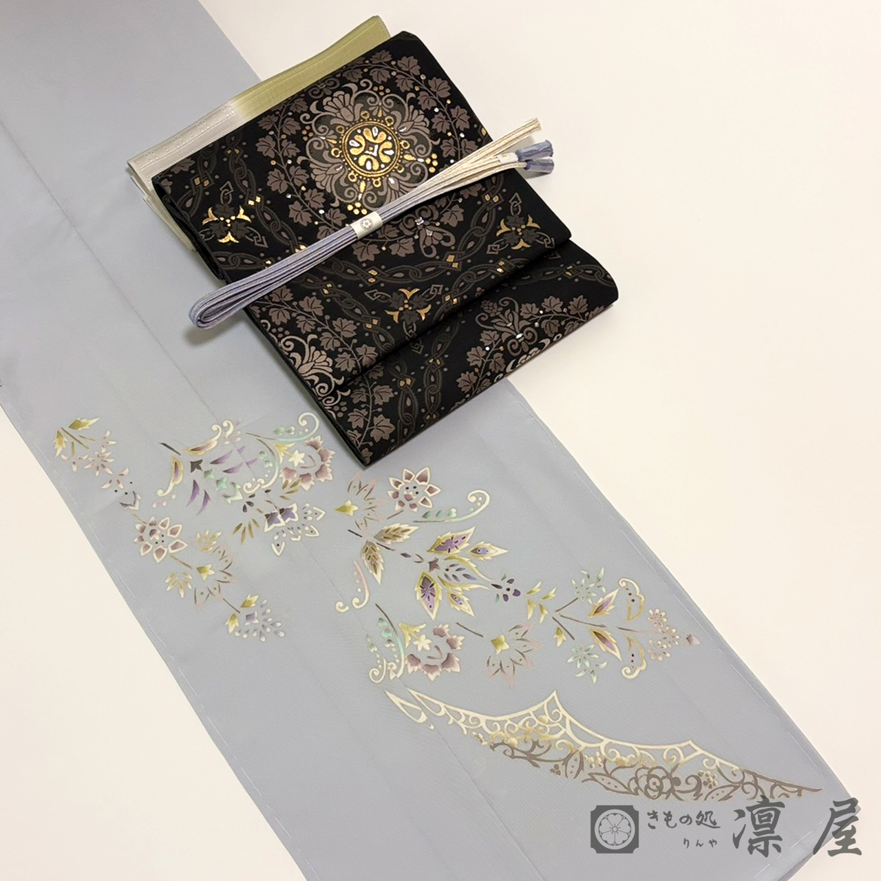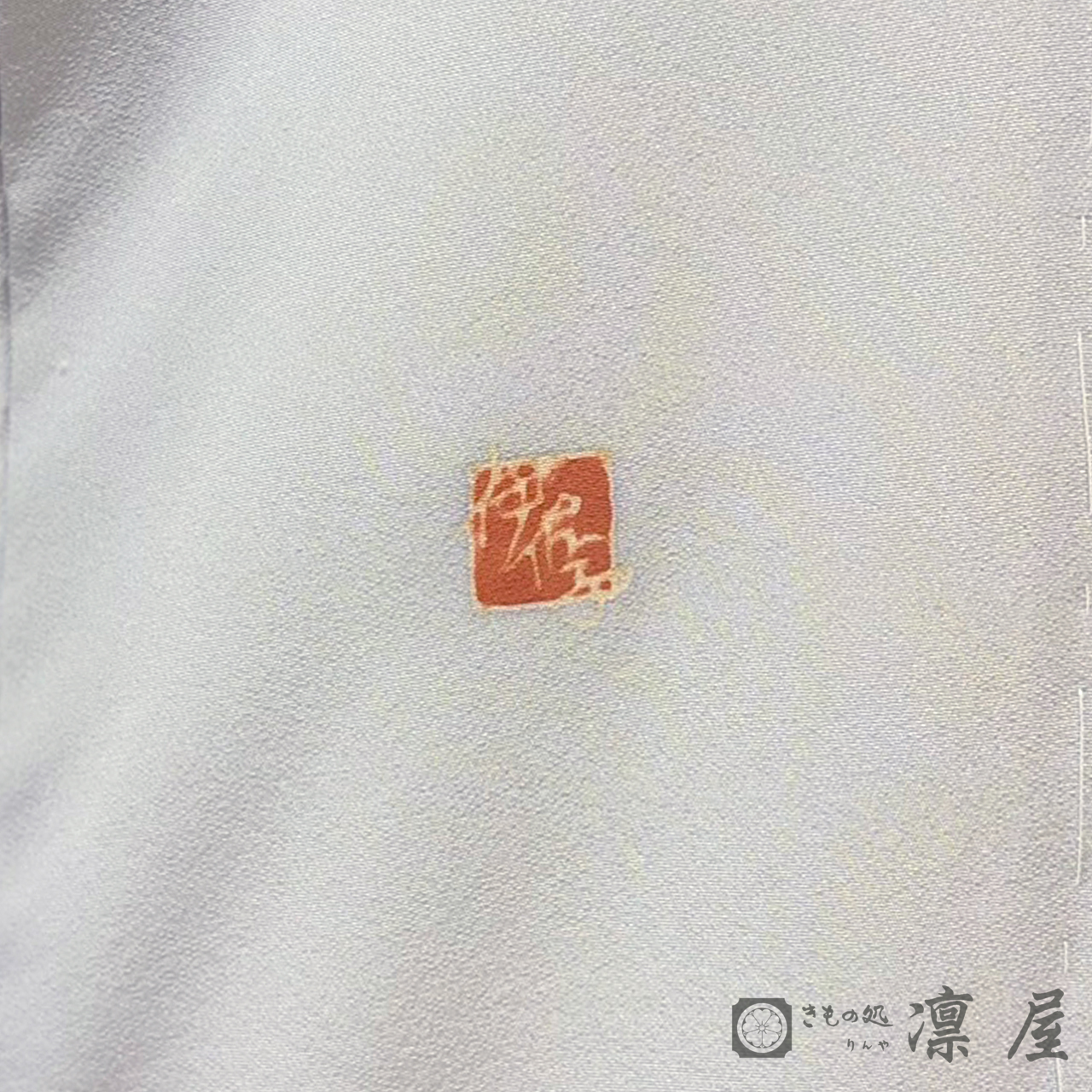 上品な白花色といった感じの淡いブルー系の地色に、正倉院文様にみられる花喰い鳥が咥えた花のような枝が描かれています。意匠化された花は題にある「桜蘭(サクララン、オウラン)」でしょうか。桜蘭は多肉質の葉と可愛らしい蝋細工のような小さな花の集まりが特徴的なつる性の植物ですが、つる性の植物は生命力が強く良縁を運ぶとも言われています。